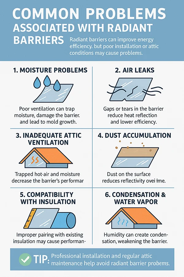 - The most common radiant barrier problems such as dust, moisture, air leaks, and poor ventilation.